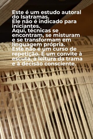 Não perca a oportunidade de transformar suas habilidades de tecelagem com o curso “Renda no Tear” do atelier Isatramas. Inscreva-se agora e comece a criar peças deslumbrantes e de alta qualidade.